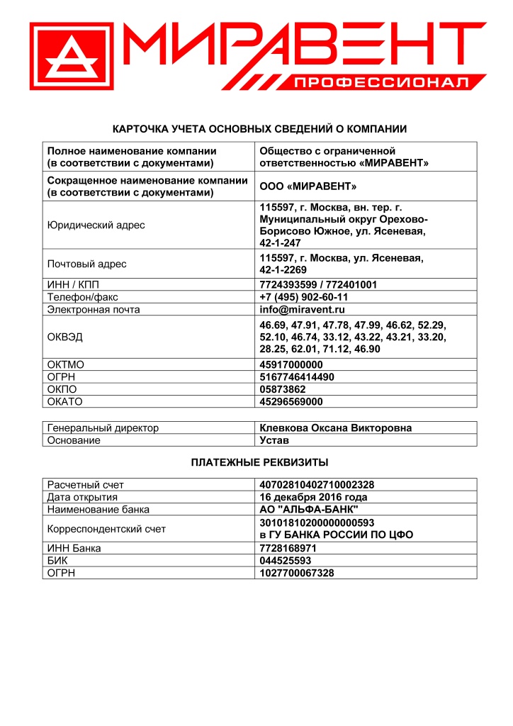 Официальные регистрационные данные ООО «МИРАВЕНТ» (карта предприятия): юридический и фактический адреса, ИНН, ОГРН, банковские реквизиты и контактную информацию. Здесь собраны документы и сведения, необходимые для делового взаимодействия, выставления счетов и оформления договоров. При необходимости мы предоставим копии подтверждающих документов по запросу.